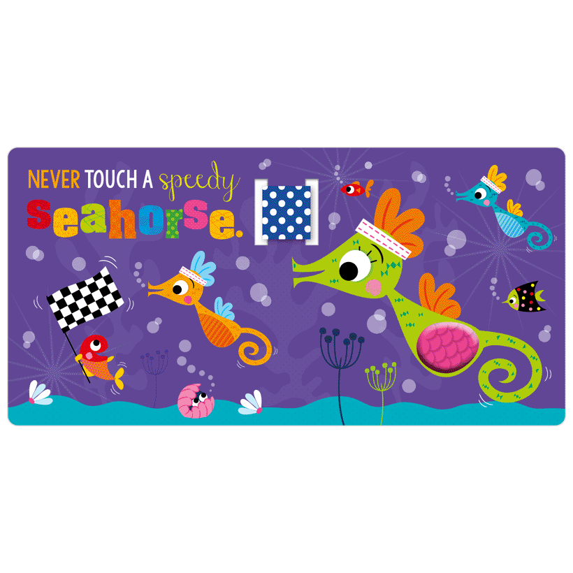 Join the playful dinosaurs in this exciting addition to our bestselling Never Touch series. The adorable mini format is perfect for on-the-go adventures. Use the handy strap and clip to attach to strollers, bags, and highchairs. The sturdy pages and bumpy silicone touches are sure to keep busy little hands entertained.