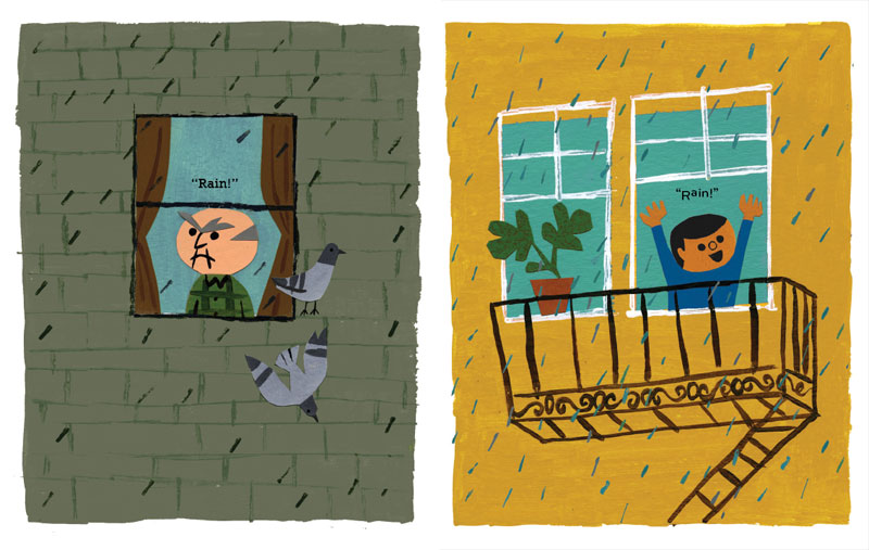 One rainy day in the city, an eager little boy exclaims, 'Rain! 'Across town a grumpy man grumbles, 'Rain.' In this endearing book, now in board book format, a rainy-day cityscape comes to life in vibrant, cut-paper-style artwork. The boy in his green frog hat splashes in puddles 'Hoppy, hoppy, hoppy!'while the old man curses the 'dang puddles.' Can the boy's natural exuberance (and perhaps a cookie) cheer up the grouchy gentleman and turn the day around?