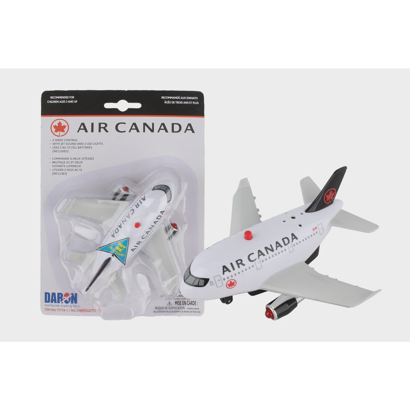 This stylized aircraft features electronic jet sound and flashing red lights, activated by the push of a button on top of the fuselage! Pull the plane back and let it go forward in the take-off position.