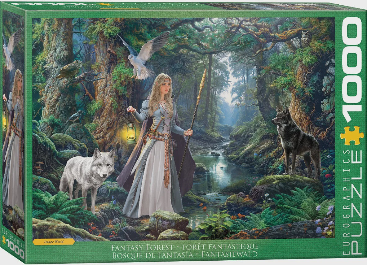 Step into a storybook world. A moonlit forest opens onto a clear stream where a guardian maiden holds a lantern and staff, watched by wolves, owls and forest birds. Rich textures—mossy trunks, flowing water, embroidered garments and soft fur—create plenty of distinct zones for a smooth, magical build.