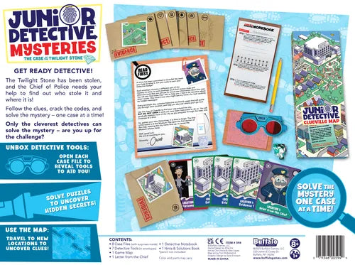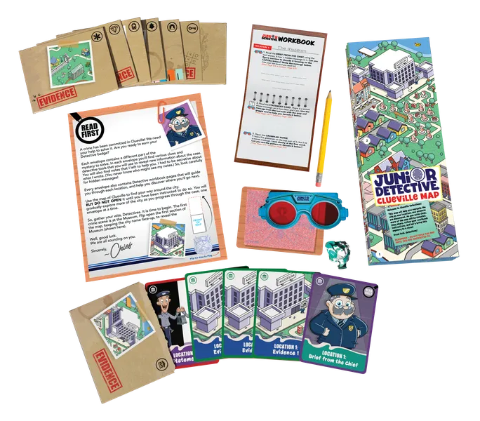 - Junior Detective Mysteries includes 8 evidence envelopes to unbox. In each envelope you will uncover detective tools and clues. Work collaboratively to decode the puzzles and solve the mystery - one case at a time!