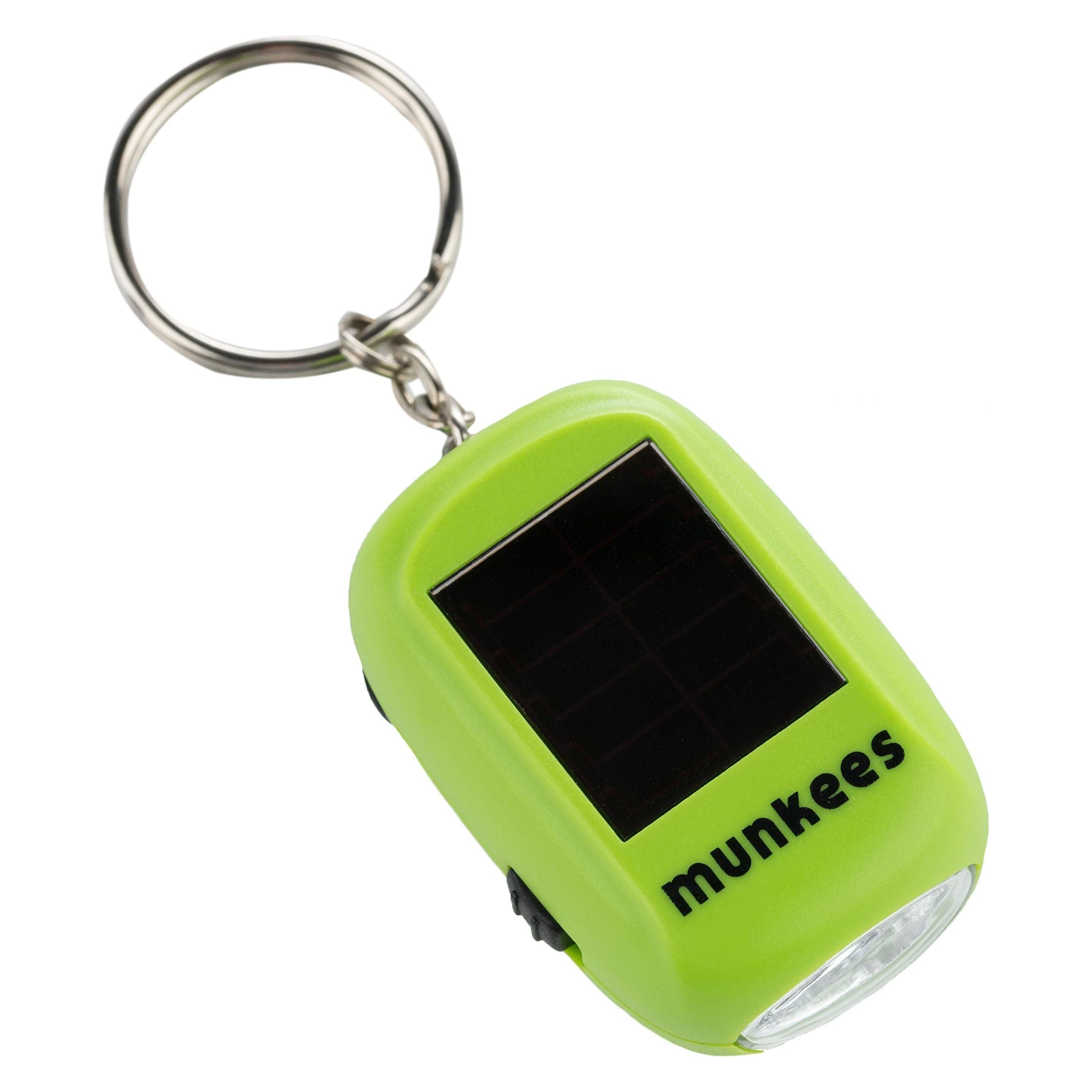 A small 5cm flashlight with a solar cell and dynamo hand crank for light at any time. No batteries required!