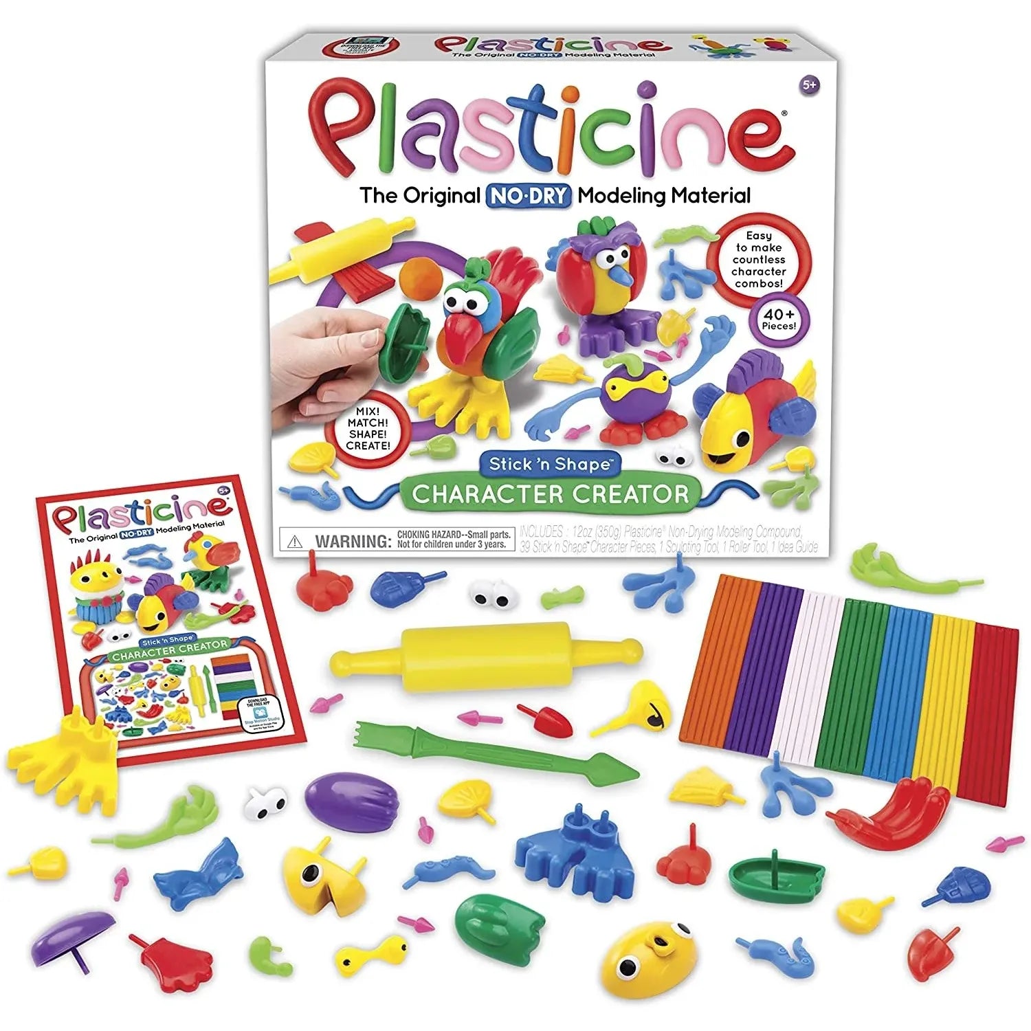 Plasticine is the original No-Dry modeling material! Kit comes with 7 colours of plasticine (50 grams of each), 39 stick 'n shape pieces, 1 roller and 1 sculpting tool, plus some handy instructions.